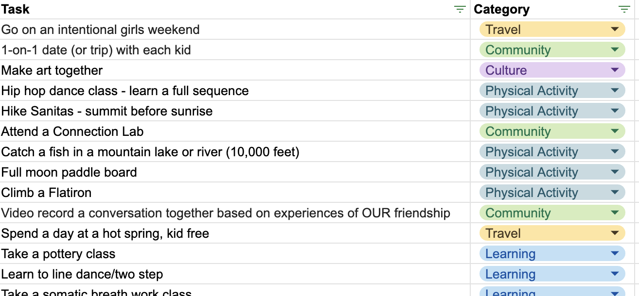 And man, oh, man my people did NOT disappoint. I’ve got adventures of all sorts - some that make my belly tickle (as Maddie would say) from nerves, some that made me cry upon just receiving them, some that will bring me peace and reflective solitude, some that I can already feel the laughs coming out. I’ve shared the list with you all so you can see what I’ll be up to this year. I’ll also be posting regular updates on my progress if you’d like to follow along!